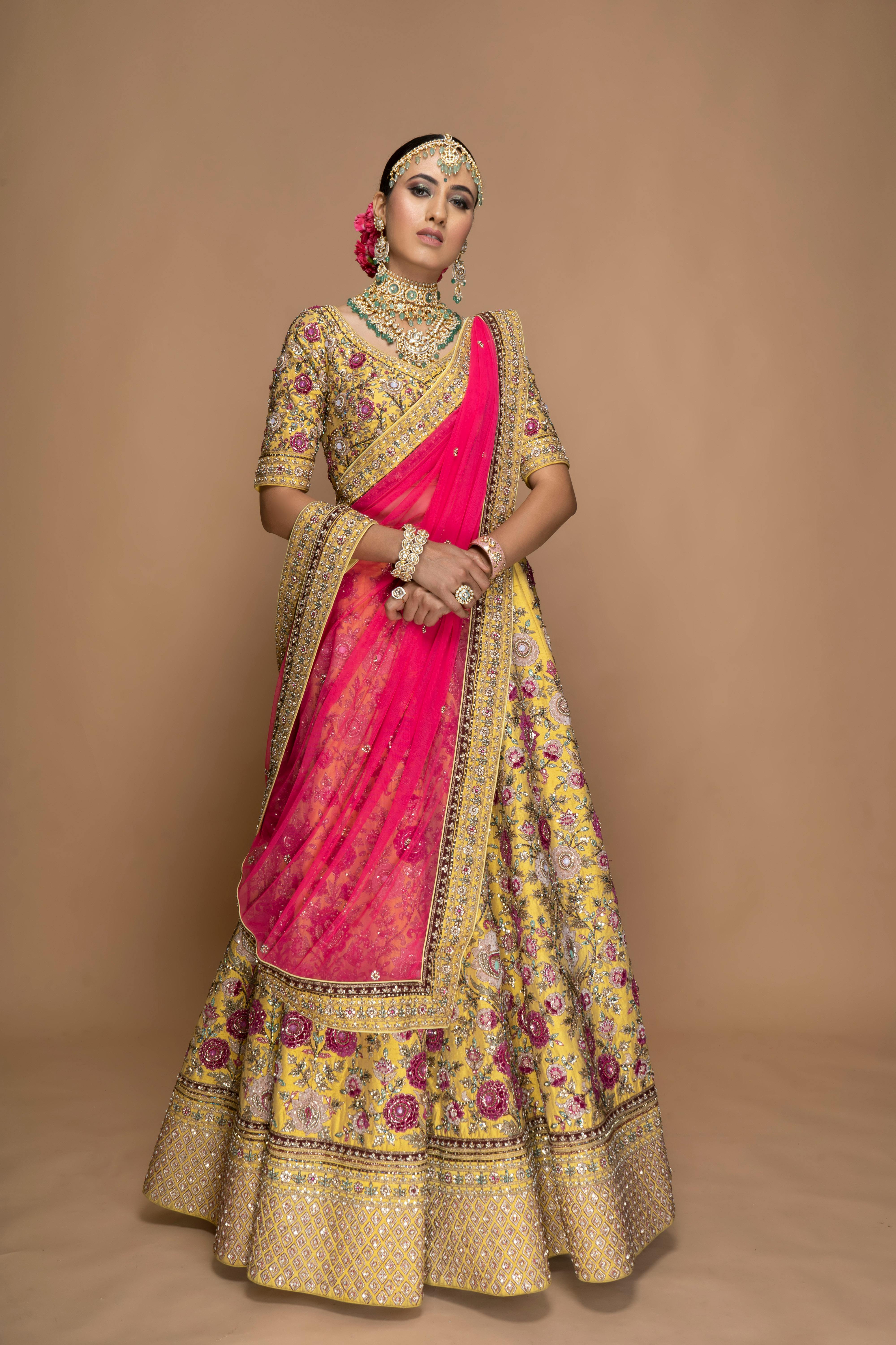 Woman wearing embroidery lehenga with heavy jewelry